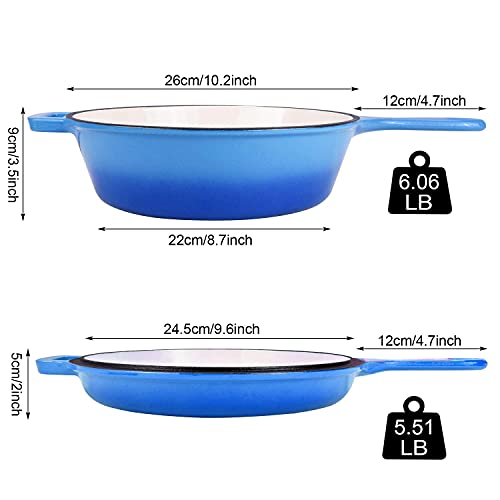 🍳 Enameled 2-in-1 cast iron multi-cooker – Heavy duty 3.2 quart enameled cast iron round skillet and 7 inch porcelain enameled cast iron shallow skillet (can be used as lid) set. Color: Blue; Saucepan(L10.2” *H3.5”), Frying Pan( L9.6″ * H2″ with handle, 9.6” in diameters); Totaling weight 11.57 lbs. Will be delivered with very well packaged, without chipped and bumped. Gift for every chef.
