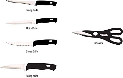 This amazing knife set comes handy with day to day kitchen job. Made ergonomically in Stainless Steel with Black handles, each of them provide a proper grip.