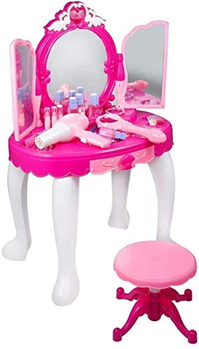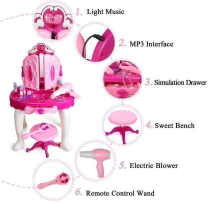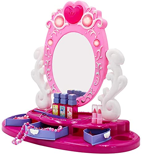 FEATURES: Playset includes; a table top play glamour mirror, mock lipsticks, a necklace, a ring, bracelets, plastic mock perfume bottles and much more! Lights will twinkle and magical sounds features can be activated through a small button placed in the center of the glamour mirror, which will create the perfect environment for your child to play!
