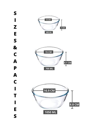 Femora Borosilicate Glass Microwave Safe All-Purpose Mixing Bowls,400 ML, 700 ML, 1050 ML, Set of 3