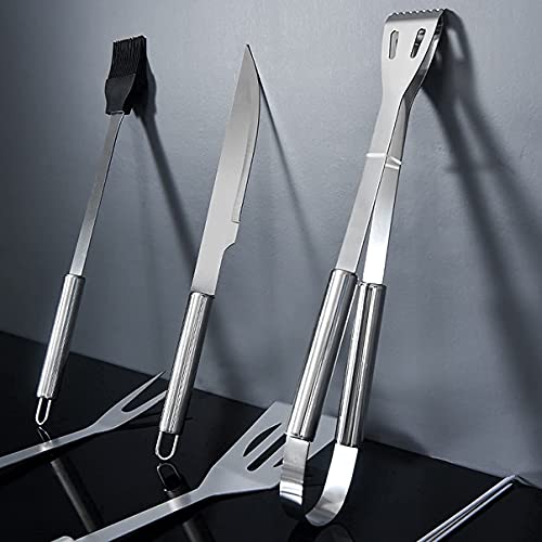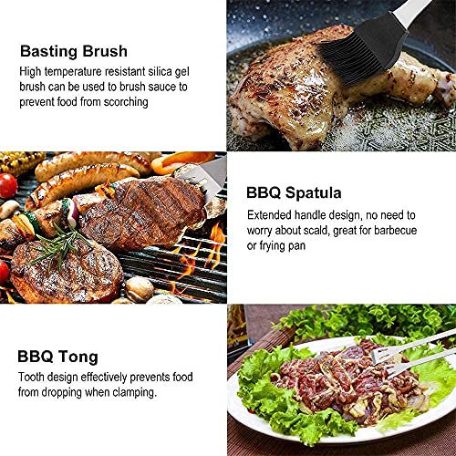Complete, versatile and functional kit — This set of BBQ tools includes knife, fork, spatula, power tongs, silicone spraying brush, four hand skewers. It can meet all your demands on the grill.