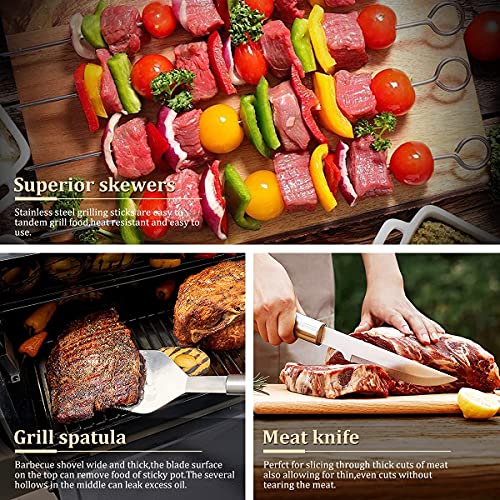 【Complete grill set】This bbq accessories comes with everything you need for a successful grilling. The 9 pieces bbq set includes 1 PC barbecue spatula, 1PC Barbecue Brush, 1 PC grill tong,1 PC Grill fork, 1 PC Knife, 4 PC Grill Stick.
