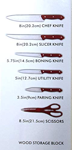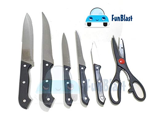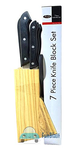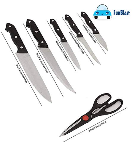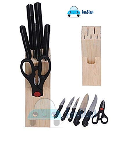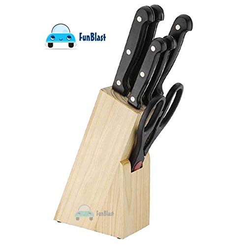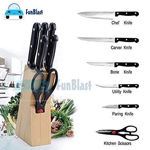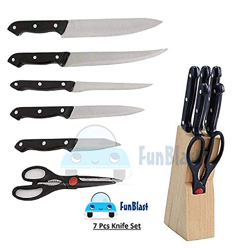 FunBlast 7 Pieces Stainless Steel Knife Set with Wooden Block includes – 1 Chef Knife – 20.2 CM , 1 Slicer Knife – 20.2 CM, 1 Boning Knife – 14.5 CM, 1 Utility Knife – 12.7 CM, 1 Paring Knife – 9 CM, 1 Scissors – 21.5 CM and Wooden Storage Block, Stainless Steel Cutting Blades, Fully Tang Handles Hand wash only.