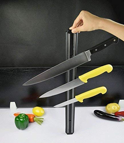 Easy to install, and the magnetic knife holder can mount onto kitchen walls with ease. Your knives will stay in place and not slide off this magnetic knife rack.