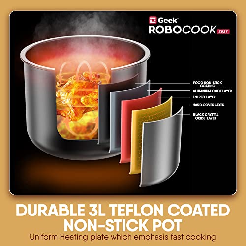 3L ZEST : BIS Certified Geek RoboCook Zest electric pressure cooker comes with a Non-stick pot (Anodised Teflon coated) which holds a compact capacity of 3L that suffices perfectly for a small family.