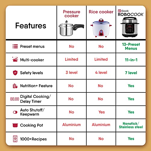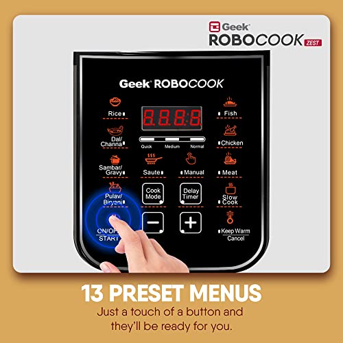 DIGITAL COOKING : Control over to you! Press Delay timer, Sauté, keep warm, or set Manual timing to your convenience. Built with 7 safety guards, Geek RoboCook electric Cooker ensures effortless and safe cooking digitally.