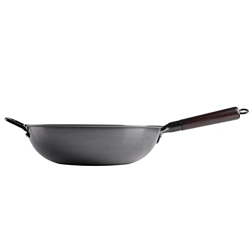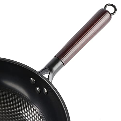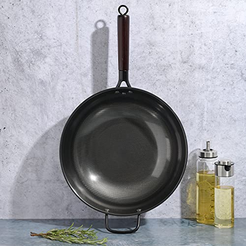 The Gibson Home Stargaze 13-Inch Wok lets you stir-fry, sear, and more with ease. Crafted from carbon steel and heat tempered for extra durability and rust-resistance, this wok seasons naturally after each use for naturally nonstick abilities that allow food to slide and release with ease. Whether you’re stir-frying veggies, eggs, meats, tofu or more, this wok distributes heat evenly and quickly for efficient and delicious results. A triple-riveted handle provides a sturdy grip while shaking and flipping food, and an extra helper handle makes it easy to carry large cooks around the kitchen. Y-shaped carbon steel handle dissipates heat and wood finish provides extra heat-resistance for a comfortable grip. Features a contemporary hammered surface and deep carbon hue. Perfect for all types of cuisines and recipes, the wok is an incredibly versatile instrument and must-have for beginner and veteran chefs alike. Woks unlock new cooking styles, recipes, and flavors that will expand your culinary horizons and impress your guests. Hand wash only to maintain the naturally nonstick patina.
