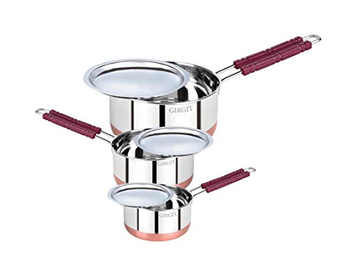 GIRGIT Stainless Steel Copper Bottom Milk Pot and Saucepan Set of 3 Piece(1Ltr,1.5Ltr,2Ltr)/Milk Pot with Lids/Saucepan with Lids/Steel Milk Pan with Lids/Copper Bottom Saucepan with Lids/Tapeli Set