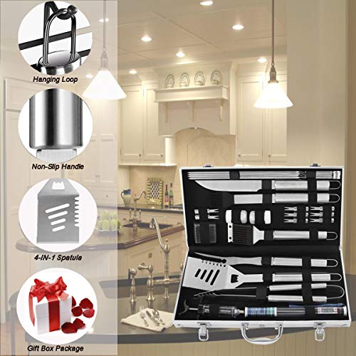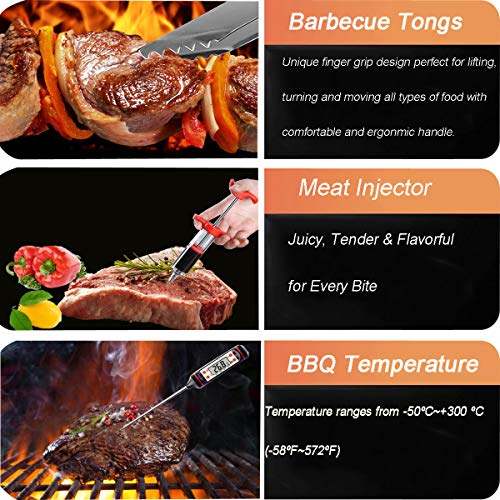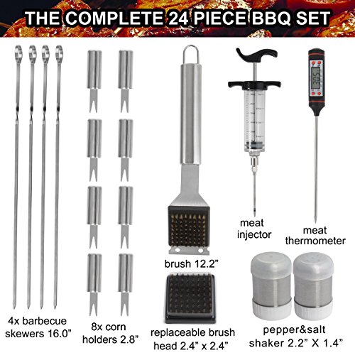 Complete Grilling Set — The BBQ tools have 4 in 1 spatula, meat fork, power tongs, meat thermometer, meat injector, cleaning brush, extra brush head, 8 corn holders, salt and pepper shakers, knife, basting brush,4 BBQ skewers and aluminum case.