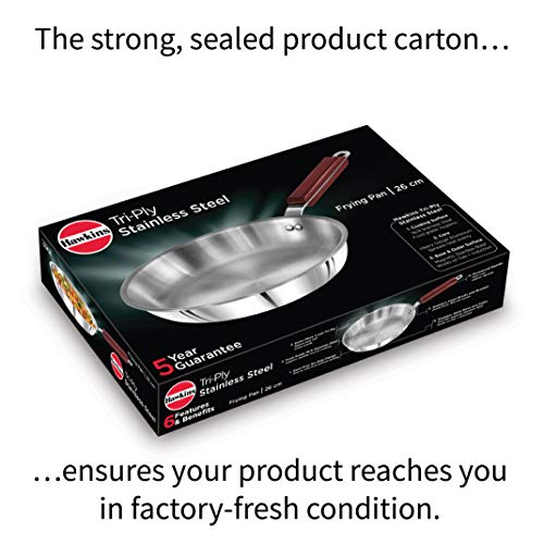 Hawkins Tri-ply Stainless Steel Frying Pan is designed to give you all the advantages of cooking in stainless steel while minimizing the disadvantages of sticking and burning that are normally associated with ordinary stainless steel. The cooking surface (inner surface) is made from 18/8 food-grade (AISI 304) stainless steel which is extremely hygienic, most durable, does not react with most foods and does not pit or corrode. The heavy gauge aluminium core spreads heat well for even cooking with no hot spots, and retains heat for quick cooking. It is sandwiched between two layers of stainless steel and does not come in contact with food on the cooking surface. The base (outer surface) is made of AISI 430 grade magnetic stainless steel. Hence this cookware can be used on all domestic gas, induction, electric, ceramic and halogen cooktops. The well curved sides of the frying Pan helps easy stirring and mixing of foods without spilling. Suitable for eggs, tikki, poora, pancakes, fish-fry and stir-frying.