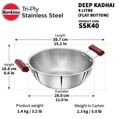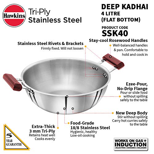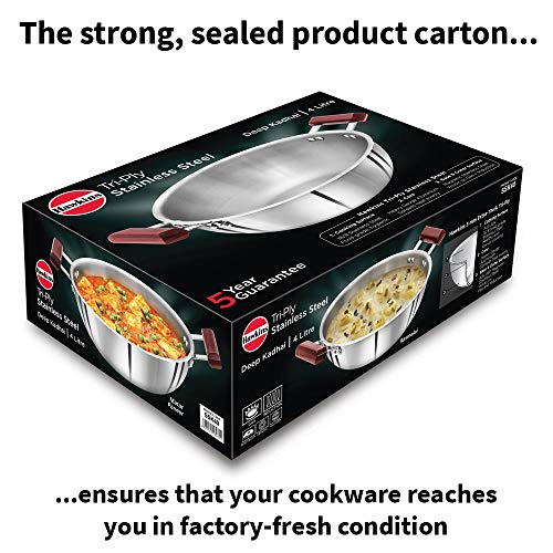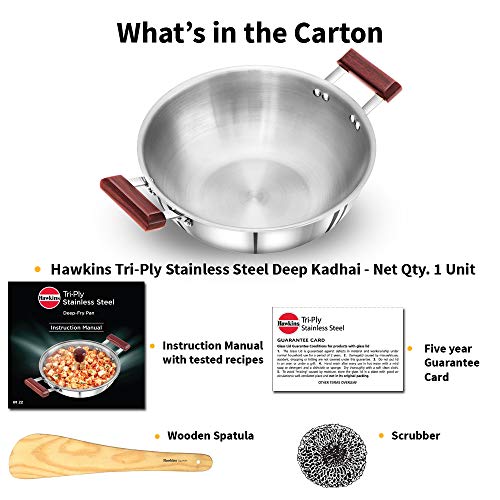 Hawkins Tri-ply Stainless Steel Deep Kadhai is designed to give you all the advantages of cooking in stainless steel while minimizing the disadvantages of sticking and burning that are normally associated with ordinary stainless steel. The cooking surface (inner surface) is made from 18/8 food-grade (AISI 304) stainless steel which is extremely hygienic, most durable, does not react with most foods and does not pit or corrode. The heavy gauge aluminium core spreads heat well for even cooking with no hot spots, and retains heat for quick cooking. It is sandwiched between two layers of stainless steel and does not come in contact with food on the cooking surface. The base (outer surface) is made of AISI 430 grade magnetic stainless steel. Hence this cookware can be used on all domestic gas, induction, electric, ceramic and halogen cooktops. You can stir without spilling and carry hot curries safely to the table due to its deep body. The rounded curved sides and extra height are most suitable for deep-frying Puri, Samosa, Wada and stir-frying Stews, Curries and vegetables. The rim of the pan has an all around ezee-pour no-drip flange – specially designed to pour or slide foods without spilling – suitable for left or right handed use.