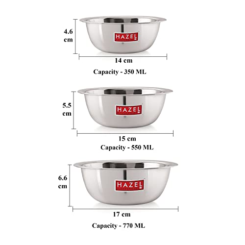 HAZEL Stainless Steel Mixing Bowl | Mixing Bowl for Cake Batter | Kitchen and Baking Accessories Items, Set of 3, 350 ML, 550 ML, 770 ML