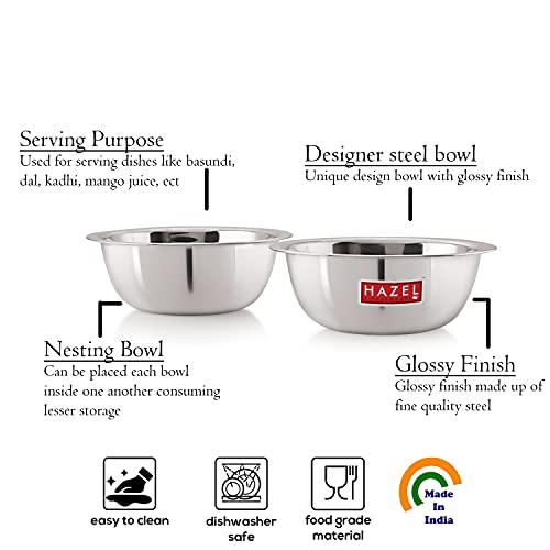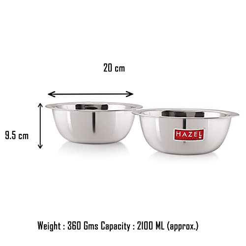Hazel Stainless Steel Mixing Bowls Set of 2, 20 cm X 9.5 cm 2100 mlProduct Dimension : 20X20X9.5 cm (LXBXH),Weight : 360 gm, Capacity : 2100 ml, Material : Stainless Steel, Color : Silver, Finish : Mirror