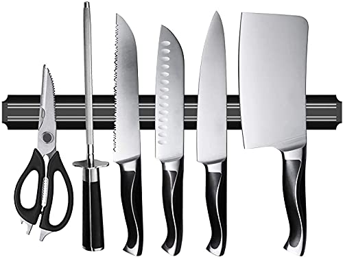 【Size & Materials】15 INCH/38CM, Magnetic and Plastic. This magnetic strip has an extended length that allows you to hold more knives than most knife blocks on the market while still being small enough to fit in well into many nooks and crannies in your mount onto kitchen walls with ease