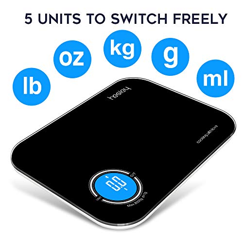 【Accurate measurements】Built-in the third-generation high sensitivity platinum sensor giving minimum value error for your ingredients or baking. this kitchen scale provides 4 measuring units(lb:oz, fl’oz, ml, g,kg), let your convent more easily and conveniently.