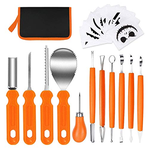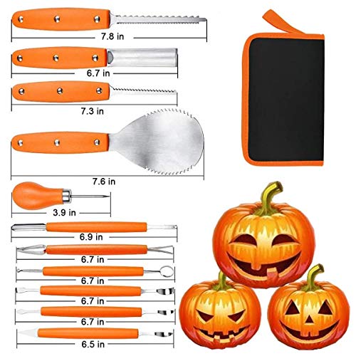 🎃【You will Get】11 Tools with a high quality canvas case and 10 pumpkin carving templates. Tools can be neatly organized and stored in the sturdy zippered nylon carrying case after use