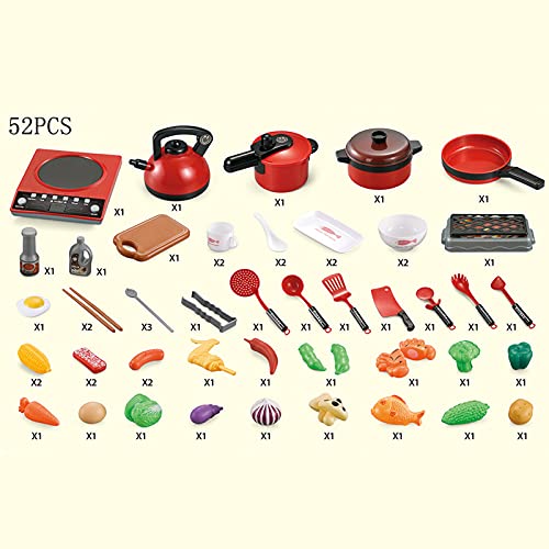 đź’[52 pieces of rich varieties of realistic cooking playset include 1 pressure cooker, 1 pan, 1 cooker, 1 induction cooker, 1 kettle, 1 barbecue rack, 2 bowls, some culinary tools and a set of imitated food and vegetables.