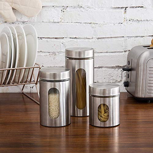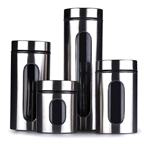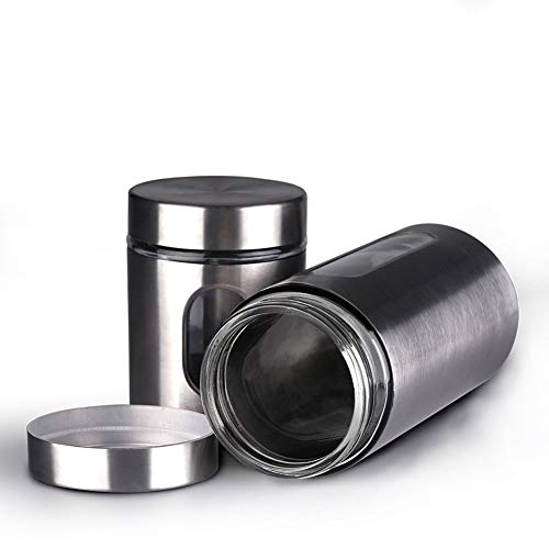 Package: contains 2 jar Capacity: These canisters capacities allow you to store different kitchen staff, such as beans, candy, sugar, coffee, snack, tea. Nice Lid: Pressure fitter airtight lid provides sealed surroundings inside, ensuring dryness and fresh for contents stored. The stainless steel grain storage jar features built-in lead-free glass material, stainless steel cover outside and it is strong and durable Clear Vision: The transparent window can be saw how much contents left, you needn’t open the lid to see Special Feature: Canister sets can nest each together for space saving when empty. Anti-fingerprint surface, making canister set as always clean.