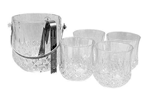 Includes: One 5.2 in. ice bucket, four 11 oz. double old fashioned glasses and one pair of stainless steel tongs