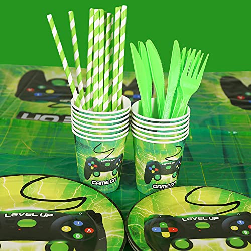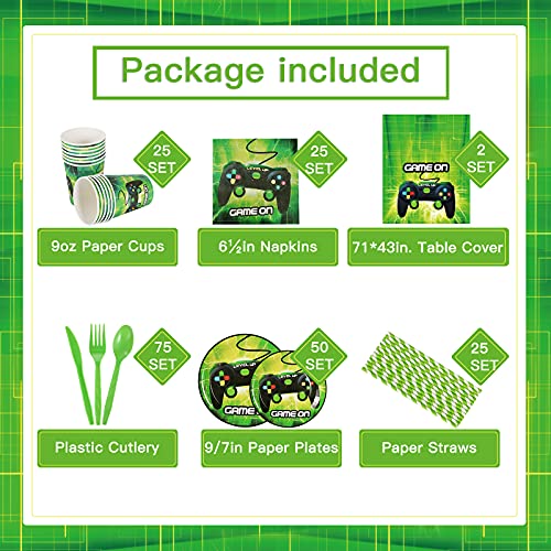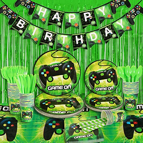 Homyplaza Video Game Party Supplies, 203Pcs Birthday Plates and Napkin Set for Boys Gamer, Includes Party Plates, Gamer Table Cloth, Happy Birthday Banner, Flatware, Cups, Straws, Napkins, Serves 25