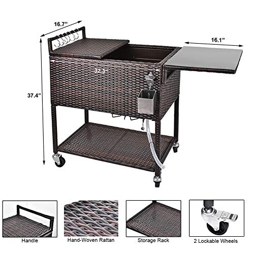【Stable Construction】 – The Cooler Cart equiped with high quality steel body for ultimate stable and durable; the exterior is covered with all-weather hand-woven rattan that is stylish and easy to clean; the interior is made by food-grade eco-friendly polypropylene(PP) without smell, resistance to rust and leakage. Convenient bottle opener and bottle cap catch bin attached to the side