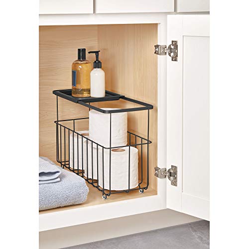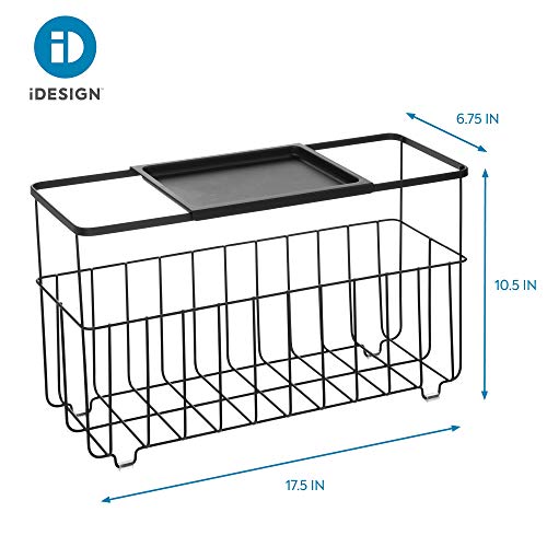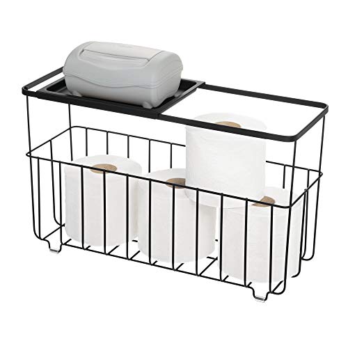 Add a functional and decorative touch to your bathroom storage with the iDesign Everett Free Standing Bathroom Toilet Paper Roll Storage Basket with Shelf. This bathroom organizer provides storage for up to six extra rolls of toilet paper, including standard, mega, and jumbo sized rolls, and features a sliding plastic tray for convenient storage of wipes, sprays, or phones. The raised base keeps toilet paper clean, dry, and off the ground, while the non-skid feet keep the basket in place. Simply place spare rolls into the basket for easy refills and access. This versatile toilet paper holder can also be used to store magazines and reading materials next to the toilet. Featuring a modern design and matte black finish, this toilet paper storage organizer complements a variety of home and bathroom decor styles. Designed for long-lasting durability, the powder-coated, rust-resistant steel construction stands up to every day use. Measuring 17.33″ x 6.60″ x 10.42″, this toilet paper roll holder is perfect for adding extra storage in compact spaces in the bathroom. With iDesign by InterDesign, you can #LiveSimply every day.