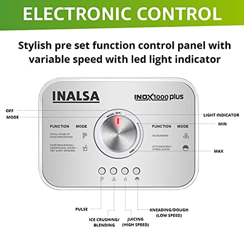 Multipurpose: Inox 1000 Plus is an all in 1 food processor that can replace several other appliances such as Blender, Juicer, Whisker, Kneader, Grinder, etc. from your kitchen.