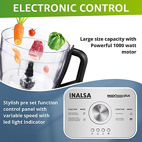 INALSA Food Processor Professional With Mixer Grinder INOX 1000 Plus| Copper Motor 1000W|Precise Electronic 25 Speeds Knob|14 Functions|3 Pre-set Buttons|Food Grade Blender Jar & 304 SS Grade 2 Jars