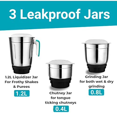 Uniquely Designed Blade and Multi-purpose Jars: Jazz Pro blades are specially designed to enable uniform and powerful grinding. They are durable & are made of high-grade Stainless Steel. Jazz Pro comes with 1.2L SS Liquidizer Jar, 0.8 SS Multi-Purpose Jar & 0.4L SS Chutney Jar
