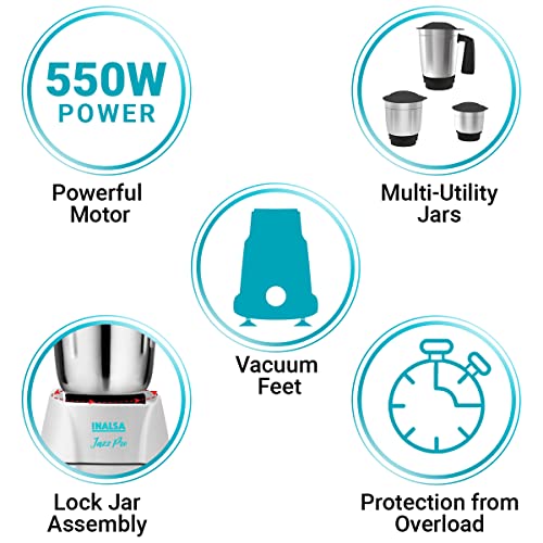 INALSA Mixer Grinder Jazz Pro -550W with 3 Stainless Steel Jars| 30 Min Motor Rating| Robust Nylon Coupler | Overload Protection| ISI Certified| 2 Year Warranty