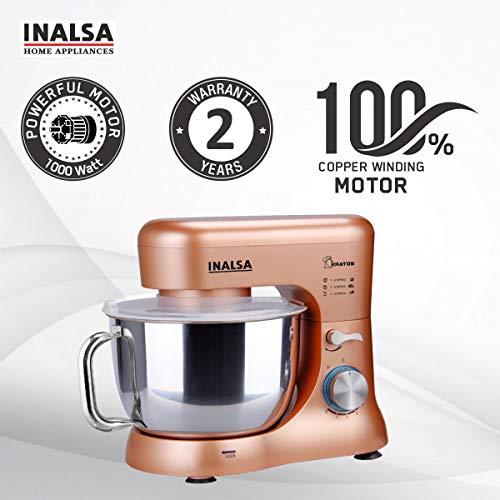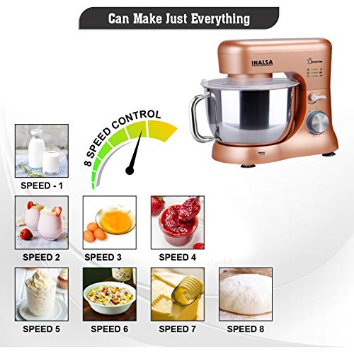 INALSA Stand Mixer Kratos-1000W | 100% Pure Copper Motor| 5L SS Bowl| 8 Speed Control| Tilt Head| Includes Whisking Cone, Mixing Beater & Dough Hook| 2 Years Warranty, (Champagne)