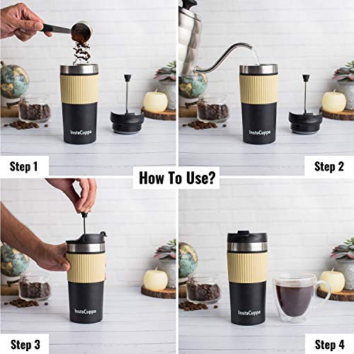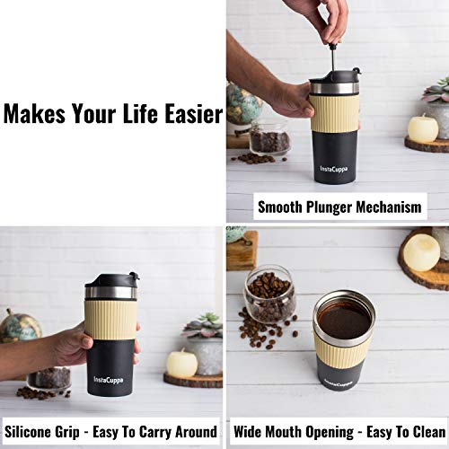 Be the first to review “InstaCuppa Travel French Press Mug, Double Walled Stainless Steel, Vacuum Insulated Thermos, Anti-Slip Silicone Grip, 400 ML, Black”