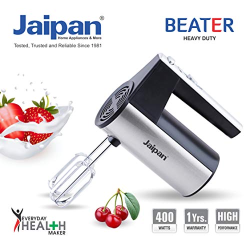 Jaipan Metal Finish High Performance BEATER is a handy way for fast and efficient cooking, Smarty portable Beater helps you in whipping, grating, blending, marketing, purees, mincing, shredding, stirring . You can do many more receipies with this BEATER too. This Smart looking portable BEATER body is made of abs material with Stanless Steel Sharp high performace DOUGH Hooks and Beater Blades. Bring home your personal genie to help you finish your kitchen chores in the blink of an eye. A multipurpose appliance which takes care of Beating , blending and juicing at the simple touch of a button! This Electric hand beater has a powerful motor that makes light of any task you entrust to it. From mashing baby food, to whipping up nutritious juices, chopping vegetables, and grinding pastes for curries, this beater / blender can do it all! Low Power Consumption: This handy hand mixer is not only effective, but also something you can use on a day to day basis as it consumes very little power. Consuming only 400W of power, it makes you work easy without overloading your power bills. Easy to Clean :The smooth plastic body of this hand blender with stainless steel blade is easy-to-clean and maintain. It comes with a wall bracket which can be fitted to a convenient place in your kitchen for easy handling and well as to keep you kitchen counter and cabinet clutter- free. The strong Steel finish /white plastic body can easily be wiped off to keep it sparkling clean. Sturdy and Stable: The contoured shape of the Jaipan hand blender with stainless steel blades provides a firm grip as you work. The shape makes it stable when you set it on your kitchen counter as you work. Rust-Proof Plastic Body : The body of this blender is made of strong food grade plastic. Firm and durable : the body is a perfect casing for its strong motor and its efficient blades. The non-reactive material is suitable for citrus juices too!