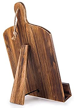 Antique inspired wooden kitchen cookbook holder stand with natural glazed finish Features a kickstand folding support and a cutting board style design