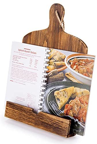 Antique inspired wooden kitchen cookbook holder stand with natural glazed finish Features a kickstand folding support and a cutting board style design