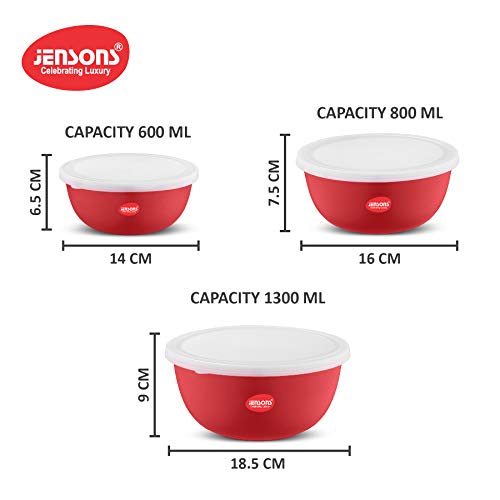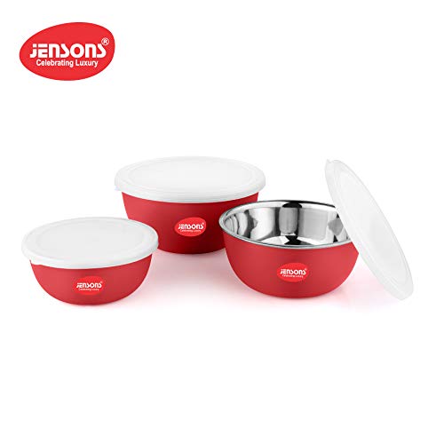 JENSONS Microwave Safe Bowl, Serving Bowl, Bowl Set, Serving Bowl with Lid, Oven Bowl Set Microwave, Kitchen Accessories Items, Diwali Gifts, Flora Stainless Steel – 600, 800, 1300 ML (Set of 3, Red)