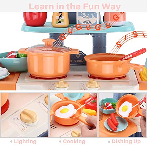 ↠Multiple Features Toy Kitchen Set:The kids kitchen table includes play stove with realistic Cooking And light & sounds,spray, play sink with kitchen accessories,which add more pretend play fun!