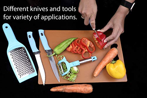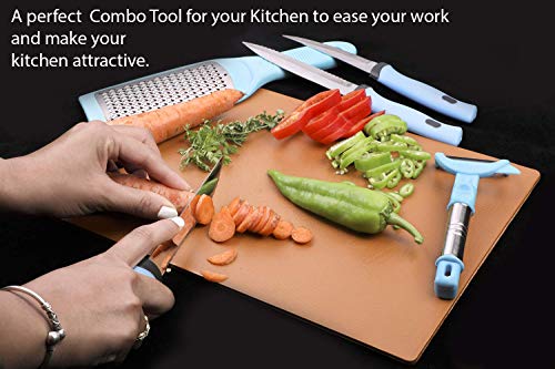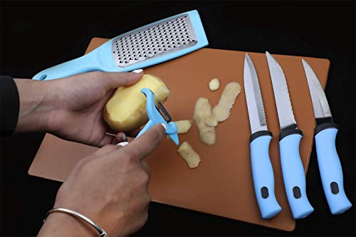 Package Includes: 3 Knives, 1 Greater , 1 Peeler and 1 Plastic Chopping board + 1 Silicone Spatula & 1 Oil Brush Set