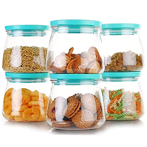 Package Content: 6 Pcs Container Jar Set With Cap | Material: Premium Quality Plastic | Airtight / 100% Leak Proof. | Capacity: 900 ml | Color: transparent.