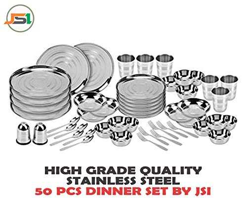 JSI Dinnerware Set Is Long Lasting And Highly Durable. JSI Brings Dinner Set Consist Of Plates, Bowls, Serving Bowl, Spoons And Forks. Best For Serving Dinner To Guest Or Family. Total Scratch Resistance And Stain Resistance, Strong in Construction And Highly durable Making It Ideal For Indoor And Outdoor Dining. The Dinner Set Comes With A Premium Silver Touch Design Finishing That’s Gives It A Premium Look. Made From Superior Quality Stainless Steel. This Dinner Set Is Stackable And Easy to Store And Less Space Consuming. Best In Quality Design And Material Used Gives This Dinner Set An Upscale Look. Ideal For Gifting On Diwali. Best Options For Redoing Your Kitchen. Exchange Your Old Dinner Set With A Premium And High Quality Stainless Steel Dinner set. As It Gives Shiny appearance And Classy For Ages, Due To High Polish ( Mirror Polish ) With Lovely Silver Touch Design.