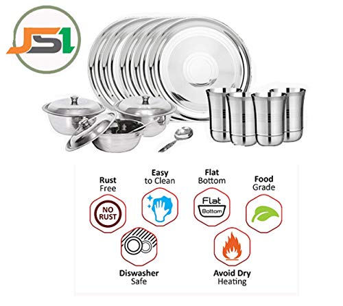 JSI Stainless Steel Dinner Set of 61pcs. Color-Silver. Material-Stainless Steel. Bring Home An Export Quality Product. It is for multipurpose use for in-home, offices, and restaurants. Ideal for a mid-sized Indian family. The best option for Gifting in any festival or occasion. Stain Resistant, Dishwasher Safe, Freezer Safe, Resistant To Corrosion. Product Contents: 6 Dinner Plates, 6 Quarter Plate, 6 Curry Bowls, 6 Dish Bowls, 6 Glass, 6 Spoons, 6 Fork, 4 Serving Spoons, 6 Chutney Katori, 3 Serving Bow With Lid, 3 Belly Bowls With Lid, 1 Rice Spoon, 1 Serving Tray, 1 Jug