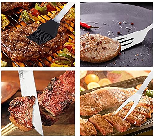 【Professional Grill Accessories】The grilling utensil set includes grill fork, knife, tongs, spatula and silicone brush, fully meeting the needs of barbecue. You can use knife to easily process ingredients, and various grilling tools help you to make various dishes skillfully. Every professional barbecue master will want a set of such barbecue tools.