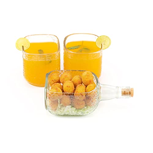 Kavi Upcycled Glass Bottle Serving Set, Eco Gift, Reclaimed Bottles Transformed into Environment Friendly Tableware, Serveware for Snacks, Juices, Starters, Cheese (White)