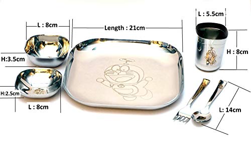 This are high quality stainless steel dinner set for kids. The dinner set have cartoon / anime laser prints. Dinnerware set consisting of 6 pieces of stainless steel cutlery for serving lunch, dinner, salad and desserts. Made using Stainless Steel that is durable and long-lasting; comes in an attractive floral design. Food-safe and has a non-corrosive surface making it safe to use. Does not retain or impart colour, odour, stains and flavours.