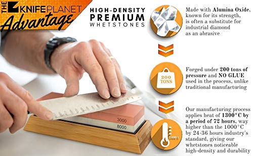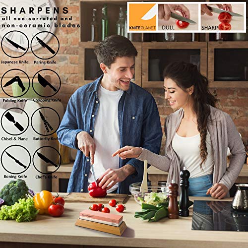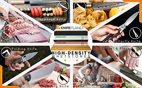 KNIFEPLANET Sharpening Stone Set 400/1000 and 3000/8000-Grit Professional, Safe Knife Sharpener Set Whetstone Set Includes Flattening Stone, Bamboo Base, and 2 Nonslip Rubber Bases
