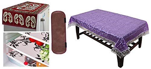 Kuber Industries Floral Design PVC 4 Seater Center Table Cover – Purple & Cloth 3 Pieces Fridge Mat, 1 Piece Handle Cover and 1 Pieces Fridge Top Cover (Red)-CTKTC2786 Combo