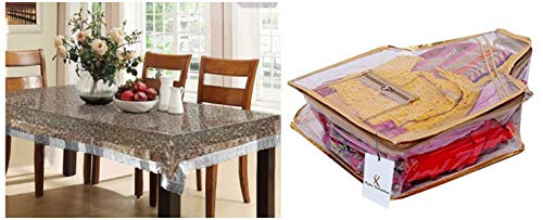 Kuber Industries PVC 6 Seater 3D Transparent Dining Table Cover – Silver & Blouse Cover in Heavy Transparent Material (Golden) Combo