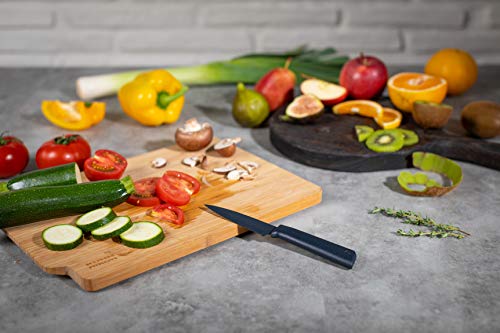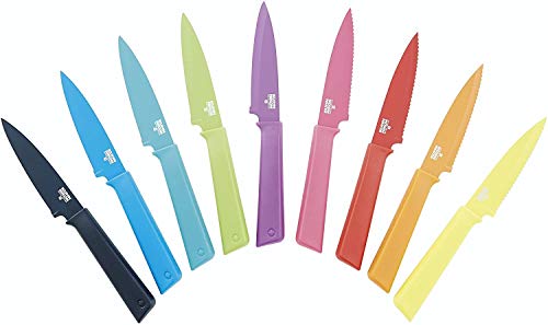 The 4″ Colori Serrated Paring Knife by Kuhn Rikon puts the fun back into food prep! With fanciful colors to please the eye, the super sharp serrated blade makes quick work of meats, crusty breads and soft-skinned fruits and veggies alike. The non-slip ergonomic handle makes sure that even while you are handling wet fruits and veggies, your hand remains comfortably in place. And to make sure that the blade, and your fingers, stay safe while storing, each knife comes with its own protective sheath. Bring it with you when you camp or head out on an afternoon picnic! The Swiss design, combined with the high-quality, ultra sharp Japanese non-stick carbon steel blade, makes this the handiest knife in the drawer! Features of the Colori 4-inch Serrated Paring Knife : Swiss design in a variety of colors Carbon steel blade Non-stick color coding on blade for easier, cleaner cuts Serrated blade Plastic safety sheath to protect and cover blade when not in use Blade Length: 4 inches