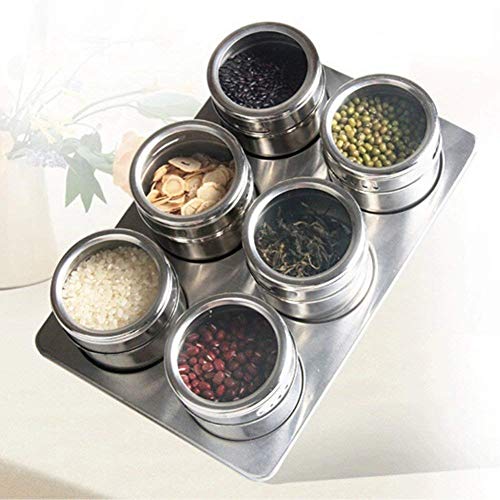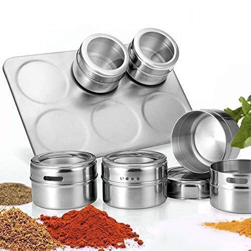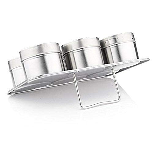 6Pcs Stainless Steel Magnetic Spice Storage Jar Tins Container with Rack Holder Pack of 1 Size (24 x 24 x 6 cm (LxBxH). ♦ Description :- 1. They’re air tight – your herbs & spices stay fresh,Unique easy twist top – helps you sprinkle evenly. 2. They clear up valuable workspace & cabinet storage,They look great & colorful stacked to a fridge or freezer. 3. Premium quality materials – won’t scratch or dent easily,Stainless-steel won’t rust – so your contents stay safe to use. 4. Strong magnets keep your herbs & spices where you put them,Hang Your Spices Magnetically From Your Rack, Wall or Fridge. 5. Our magnetic spice tins are very strong. Fix them to the side of the fridge or freezer and whenever you open or close it, the spice jars will stay in place. 6. This magnetic spice rack is a thing of otherworldly beauty and hands down the best way to organize your spices and more! Here are just a few ideas. 7. Free up valuable counter space by attaching the chrome rack to the wall.Sit the rack at a tall 70 degree angle to keep counter clean and clutter-free. 8. Forgo the rack altogether and be a space hero by attaching your magnetic bottles to the side of your fridge. Go on, be a space rebel! A space ranger! A space arranger. 9. Dimensions:24 x 24 x 6 cm (LxBxH)(Packaging), Each spice tin is 2.5 inches in diameter, and 1.75 inches high.