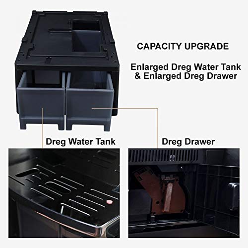 The automatic coffee machine with waste container comes with the enlarged dreg water tank and enlarged dreg drawer. It can hold water and coffee cakes waste for upto 80 cups.